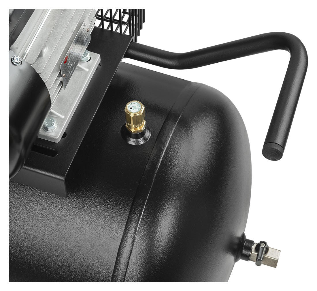 Le niveau sonore de ce compresseur n’est que de 74 dB (les compresseurs comparables sont généralement plus bruyants !). Cet effet a été obtenu grâce à la conception spéciale du moteur – un ressort y est attaché d’un côté et une courroie repose dessus de l’autre.