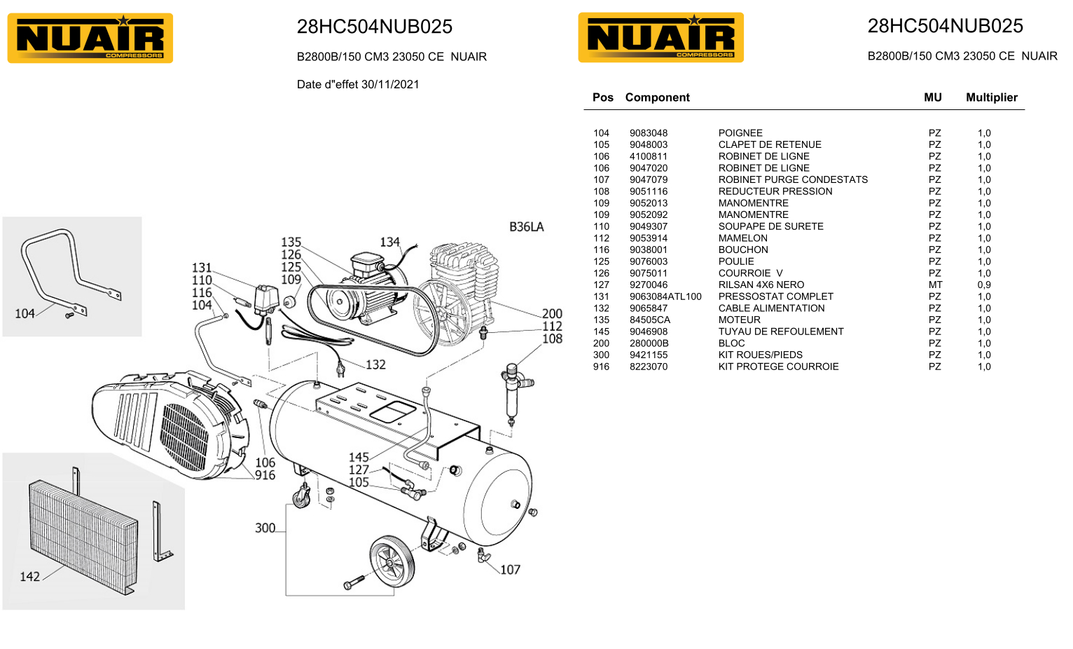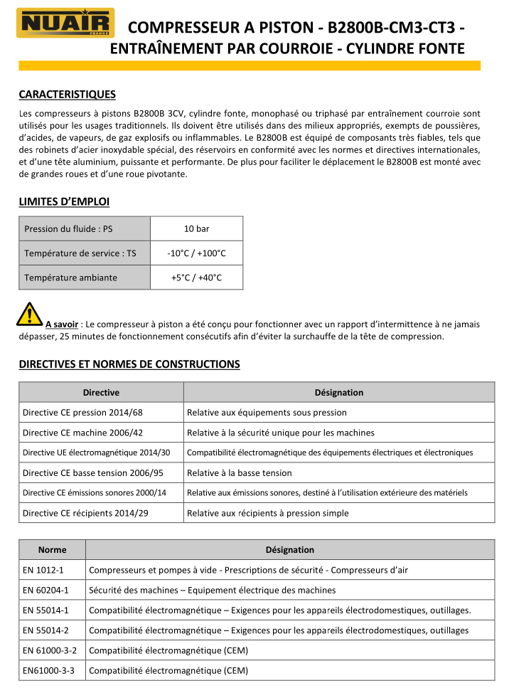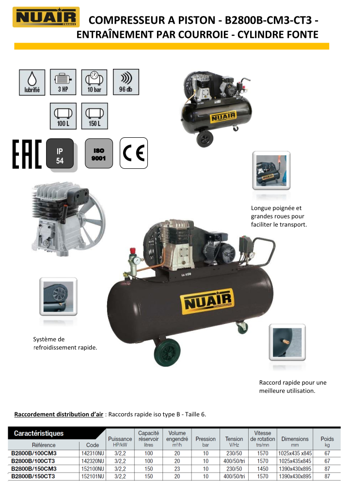 Le compresseur à piston NUAIR B2800B/150CM3 est équipé d’une tête en aluminium, cylindres fonte, très fiable et performante. Réservoir de 150 litres. Tension : 230 Vca.