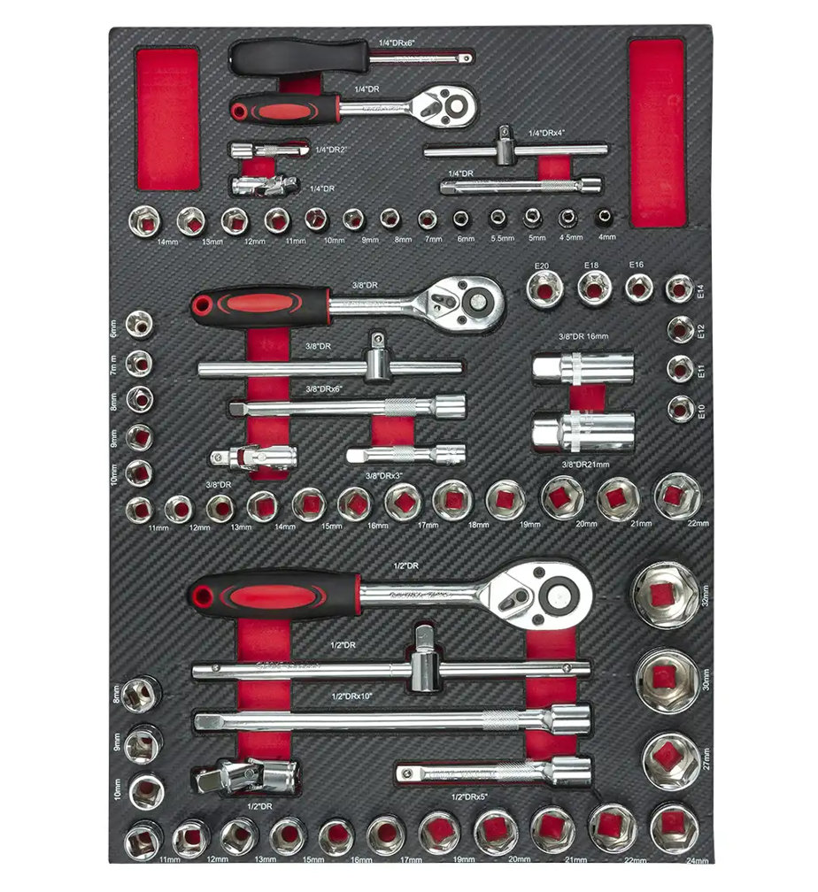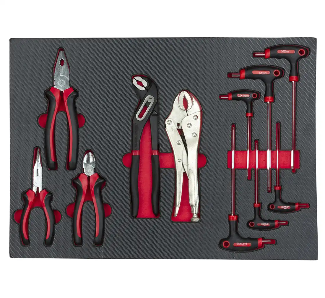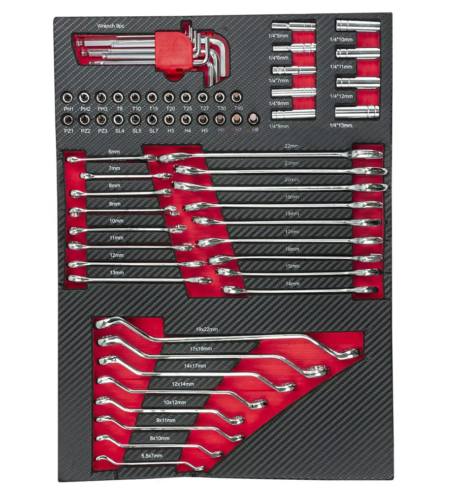 7 tiroirs coulissants avec outils et accessoires de haute qualité organisés en plusieurs groupes : clés à douilles avec cliquets clés mixtes tournevis pinces et clés Allen cutters, pinces, marteau 2 tiroirs inférieurs pour gros outils (à disposer soi-même)