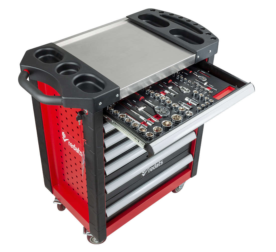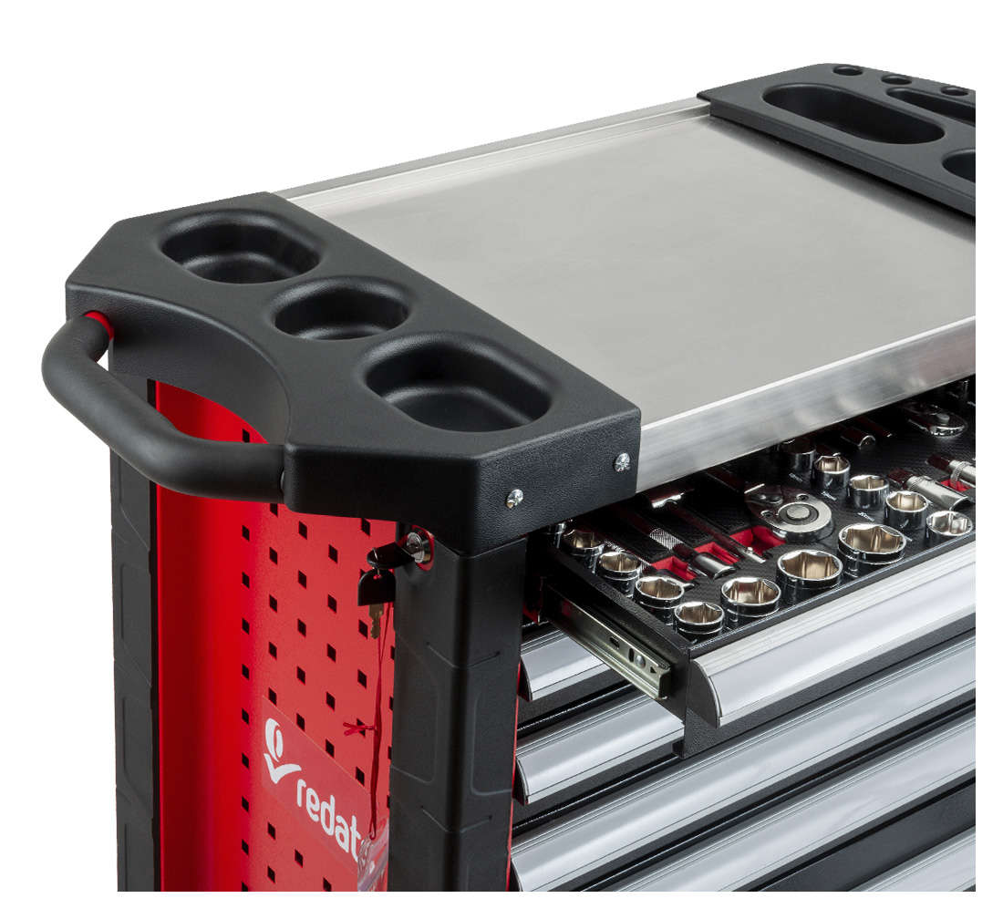 Un chariot d’atelier robuste avec sept tiroirs et un équipement avec les outils d’atelier professionnels les plus couramment utilisés. Les tiroirs ont des glissières avec roulements à billes, une serrure centrale et des serrures pour tiroirs individuels.