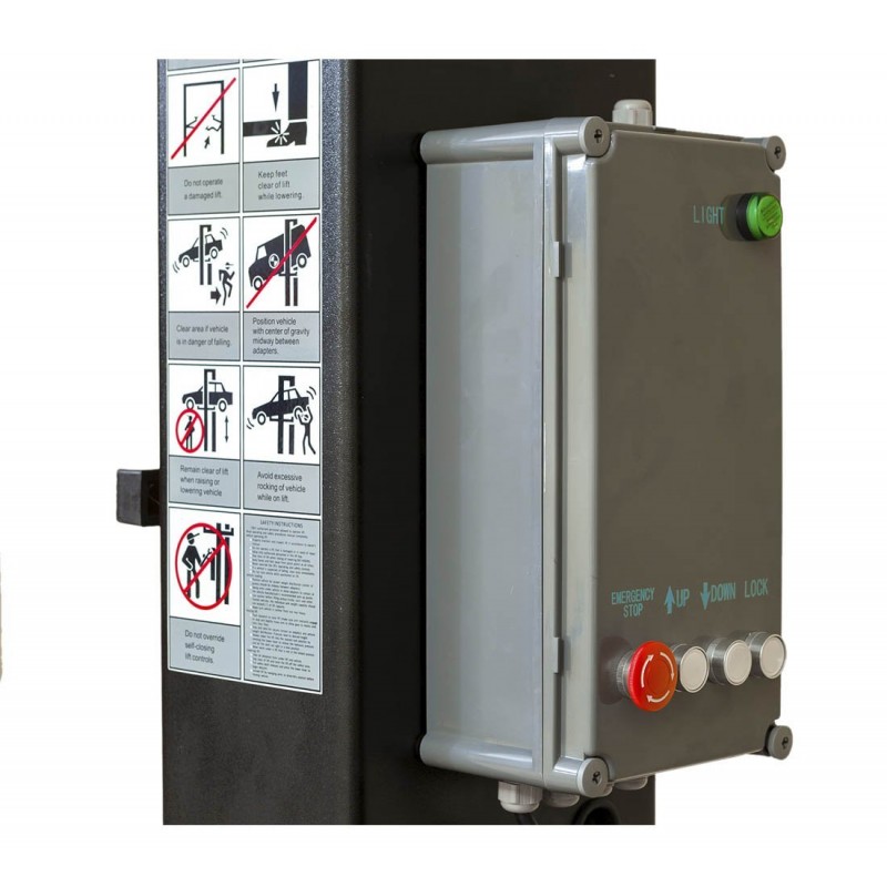 La console de commande se compose de quatre boutons: STOP pour immobiliser immédiatement le pont. UP pour enclencher la montée, DOWN pour démarrer la descente jusqu’aux cales de sécurité, presser une seconde fois abaisser, et enfin le bouton LOCK pour verrouiller à la hauteur souhaitée et travailler en toute sécurité. Le tout pour un fonctionnement vraiment simple!